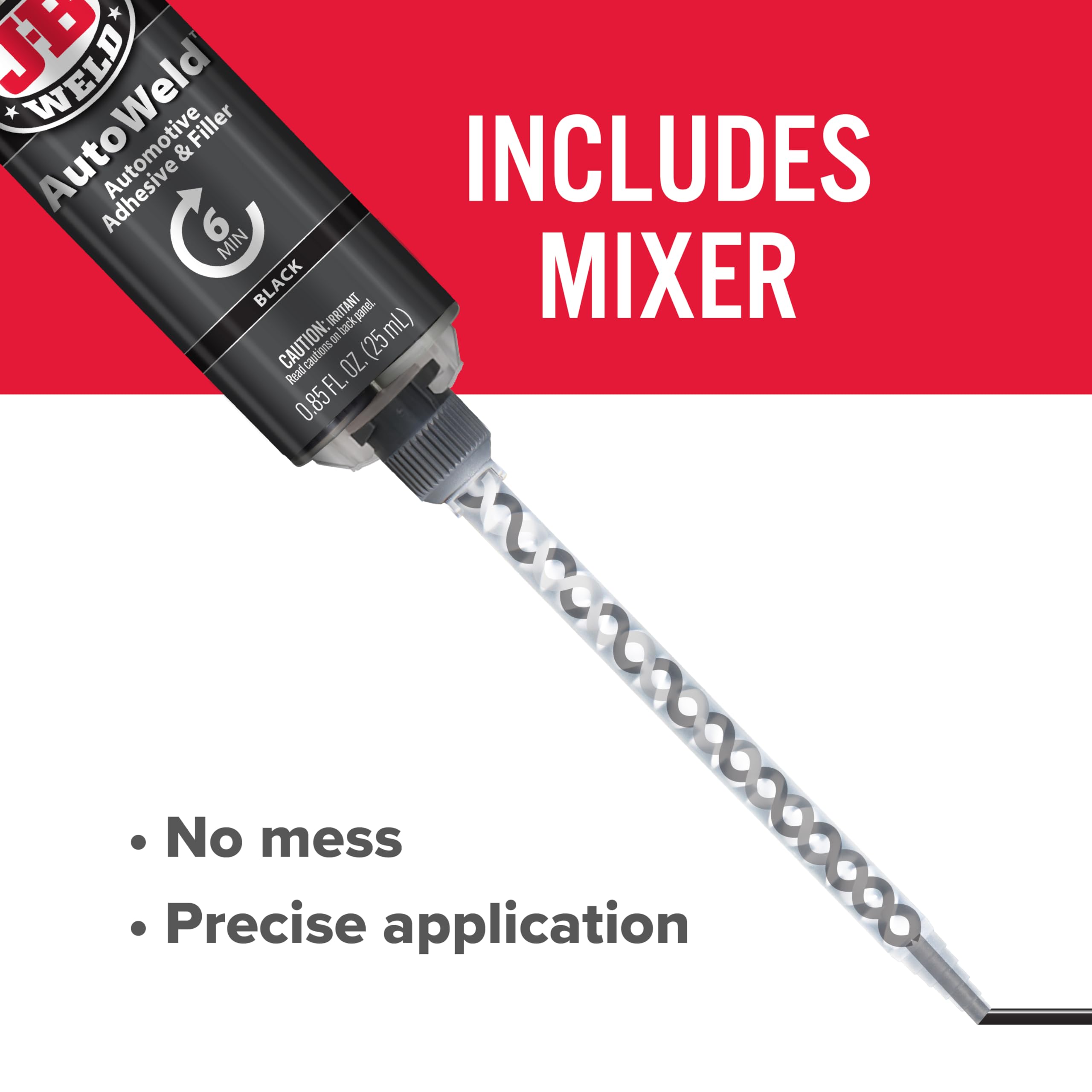 - J-B Weld AutoWeld comes with self-mixing static mixer making the application easy! Prior to attaching the static mixer make sure equal parts of the A and B side are coming out the syringe, then apply the mixer and go!