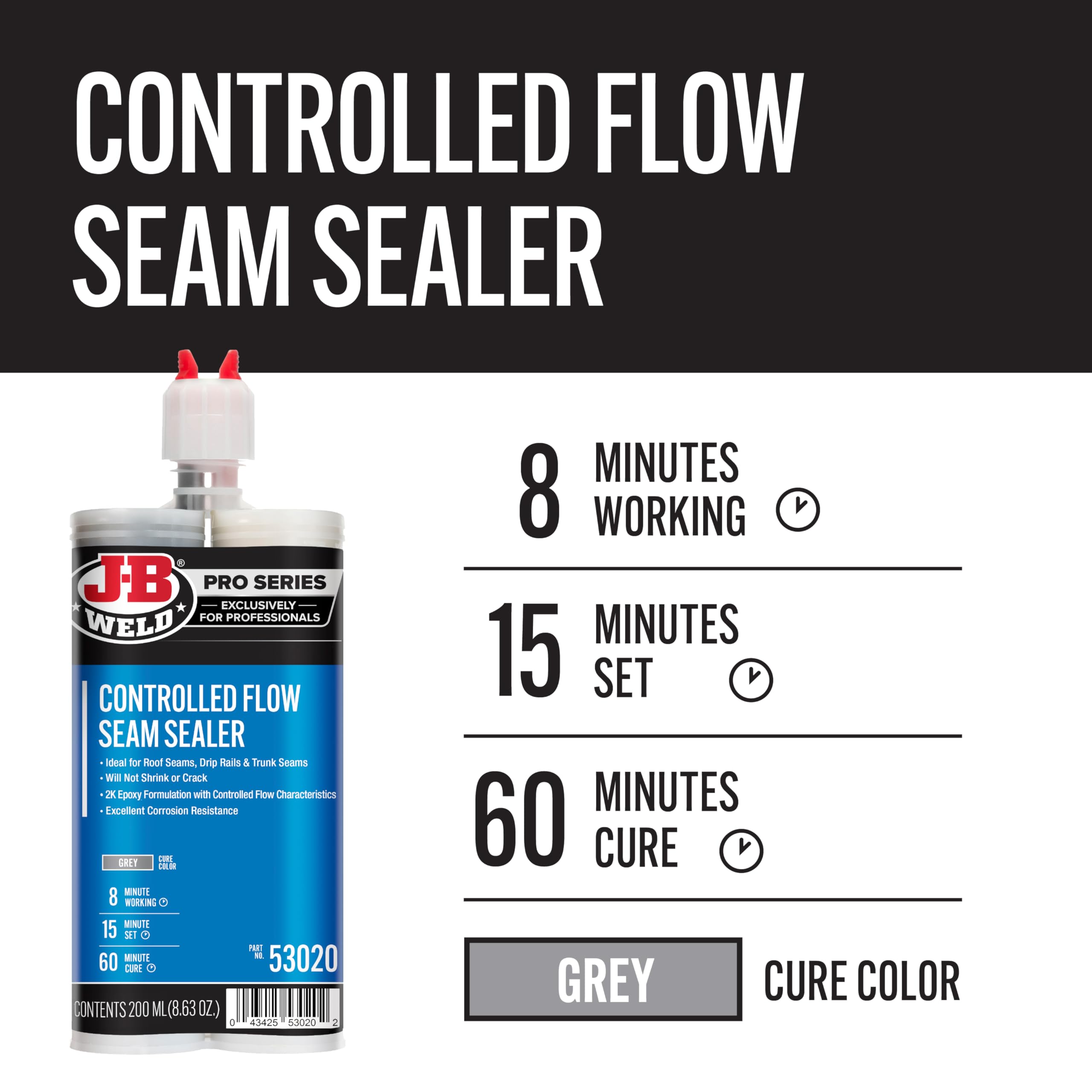 - J-B Weld Pro-Series Controlled Flow Seam Sealer #53020 is a high-performance 2-part epoxy formulated material which has excellent corrosion resistance which stays flexible and will not shrink or crack.